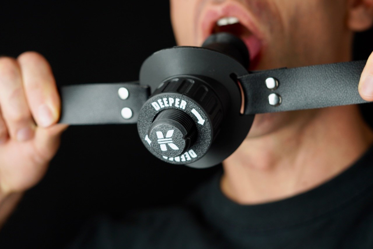 Extend our Gag OPEN MOUTH* with our new and highly innovative deep throat trainer. Rotating the knob pushes the trainer slowly but inevitably deeper into your mouth! You will start drooling immediately and start choking as it is pushed further. Keep in mind that this toy is only for advanced BDSM players!
